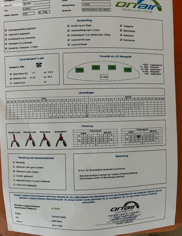 Der Schirm wurde gerade frisch gecheckt und befindet sich in gutem Zustand (sh. Bild des aktuellen Checks).