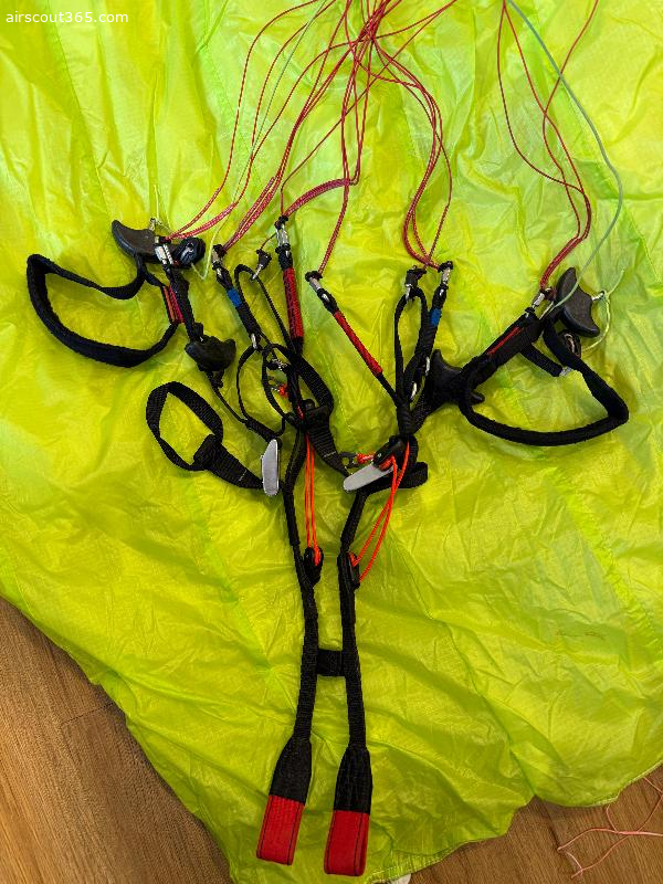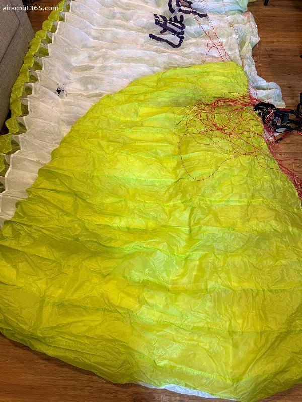 Sehr gepflegter Zustand, keine Crashs, sauber. Tuch, Leinen und Risers tiptop. Es gibt einen minikleinen Patch (ca 1€ Münzen groß), quasi unsichtbar, siehe letztes Foto. Sonst makellos.
